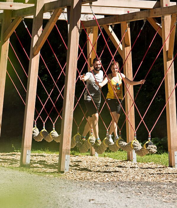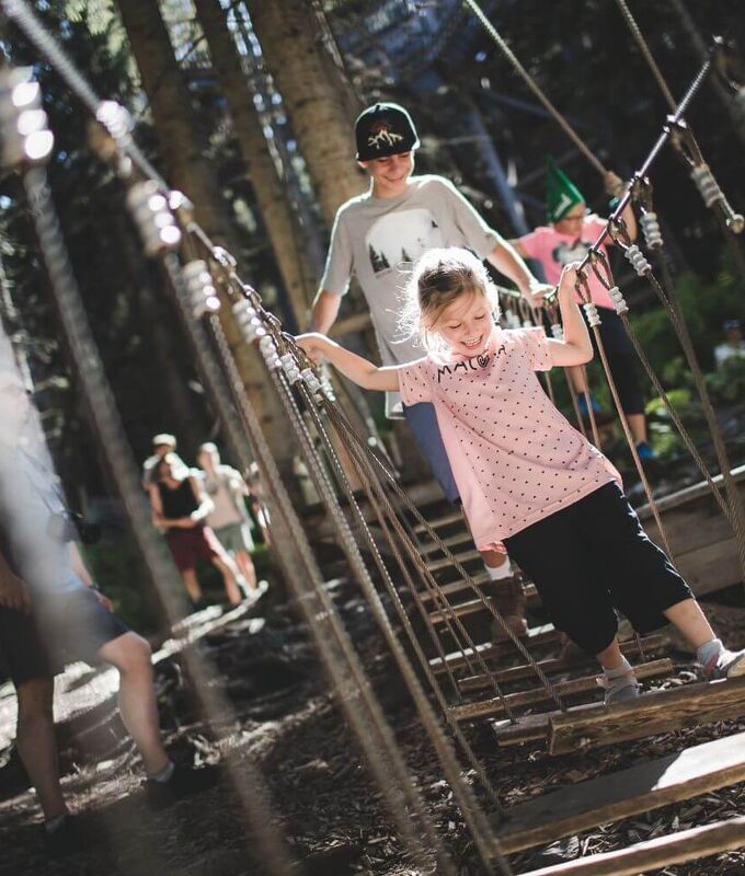 Jede Menge Action bieten die Angebote im Talschluss für größere Kinder und Erwachsene. Der Hochseilparcours ist mit einer Länge von 8 km und rund 200 Stationen Europas größter Hochseilgarten. Neu ab Sommer 2025 ist der Mini-Parcours, in dem auch Kinder ab 3 Jahren bereits ihre Kletterkünste unter Beweis stellen können. Im Jump & Slide Park erwarten euch Riesenrutsche, Megaspringtürme und eine 13 m lange Boulderwand.