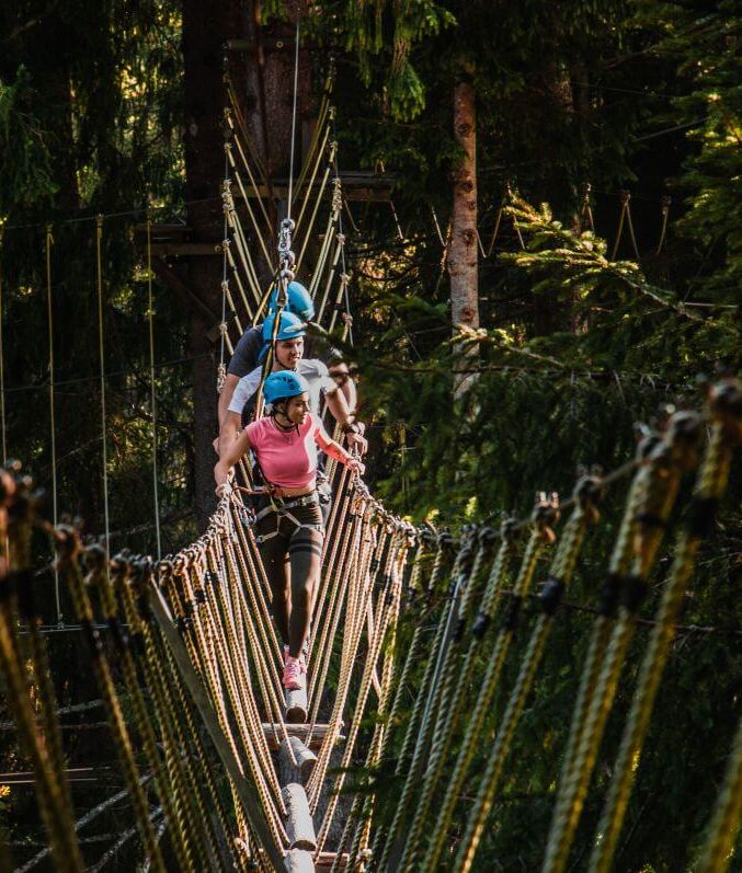 There is plenty for older children and adults to do at the end of the valley. With a length of 8 km and around 200 stations, the high ropes course is the largest high ropes course in Europe. The mini course, which opens this summer (2025), is where children from the age of 3 can put their climbing skills to the test. The Jump & Slide Park features a giant slide, mega jumping towers and a 13-metre-long bouldering wall.