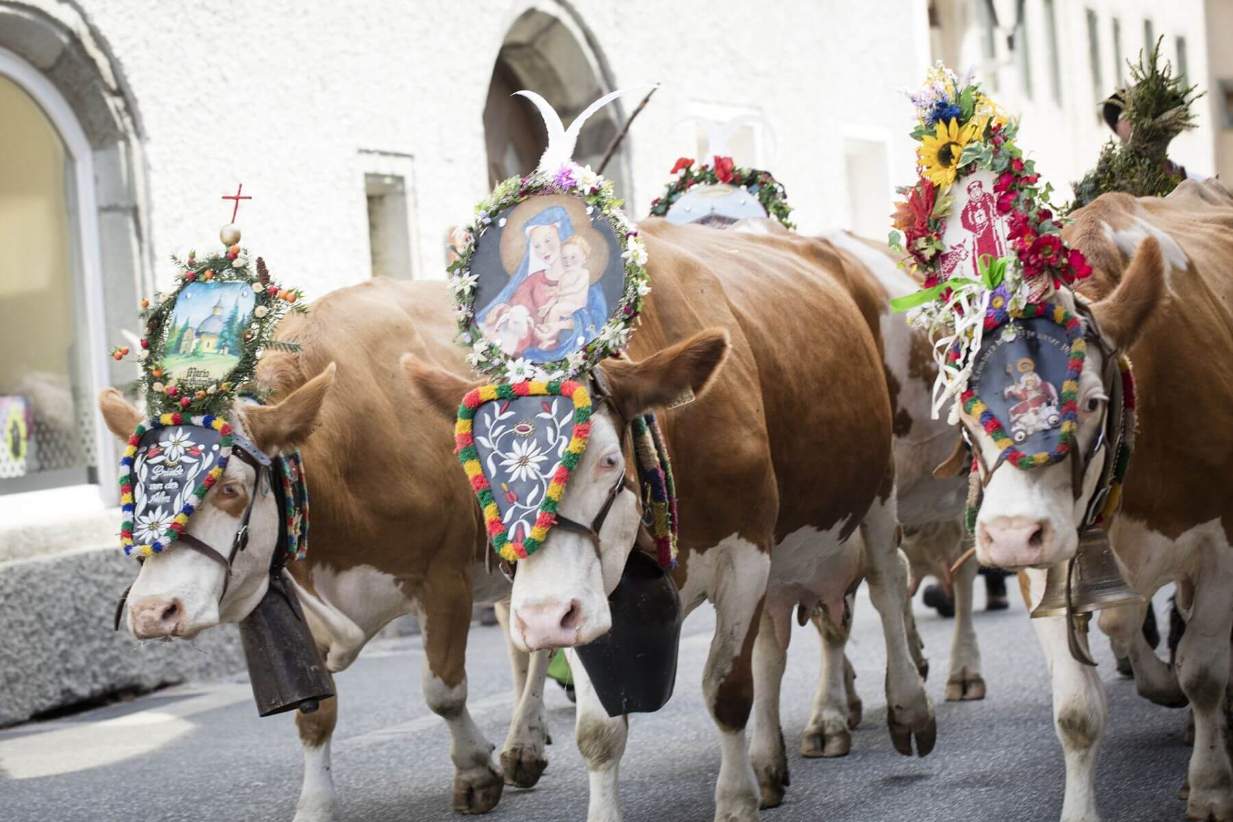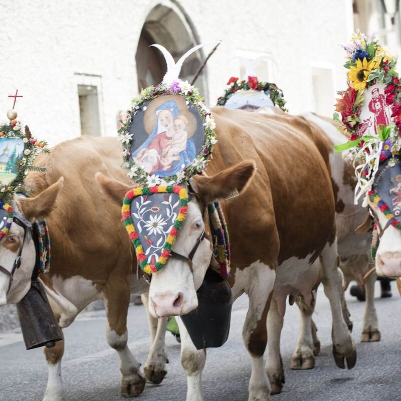 The animals are festively decorated with colorful ribbons, bells and mirrors on their way from the alpine pasture to the barn. This is a way of honoring the animals' health and thanking them for an accident-free alpine summer. If there has been a stroke of fate or bereavement, the elaborate decorations are dispensed with or black ribbons are used as mourning florals.