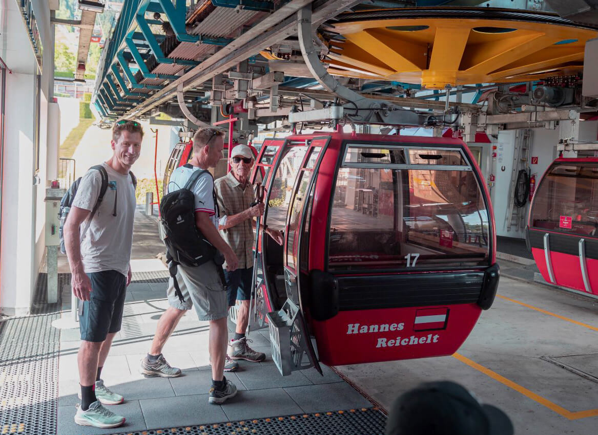 The world-famous Streif run is part of the Hahnenkamm, which in turn belongs to the Kitzbühel Alps in Tyrol. In just a few minutes, the hikers easily rise more than 850 meters in elevation before gliding into the Hahnenkammbahn mountain station at 1662 meters above sea level.
