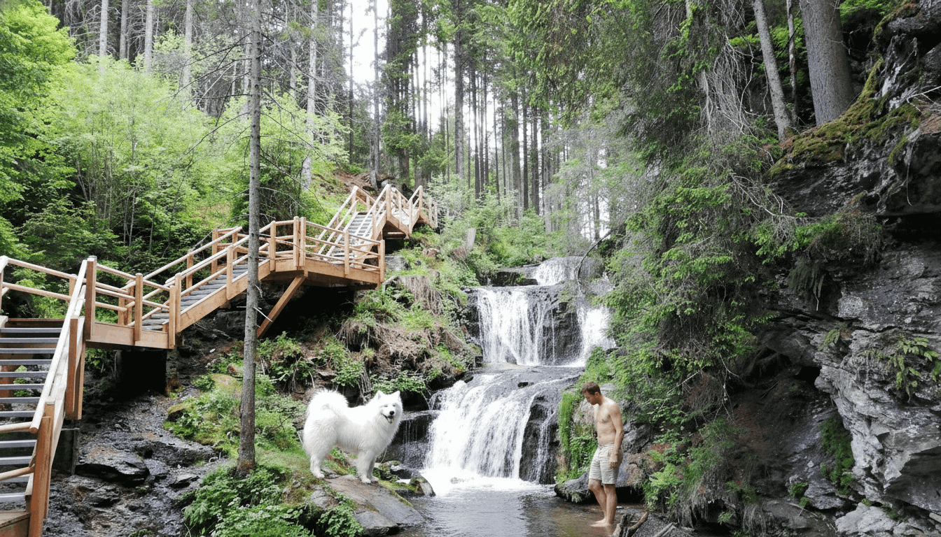 Shady adventures for hot days, with a snack finale. When the sun is beating down, there's only one thing for it: head for the gorge! The Graggerschlucht gorge near Zeutschach is the perfect micro-adventure for hot days, cool, shady, with babbling brooks and wild footbridges. The trail leads through a mystical gorge to the "7-Kirchen-Blick" observation tower, where not only the view but also the Zeischgl wine tavern with snacks and fresh water from the fountain awaits you and your buddy. An absolutely top excursion and at the same time an insider tip for you and your dog in the Murau region.