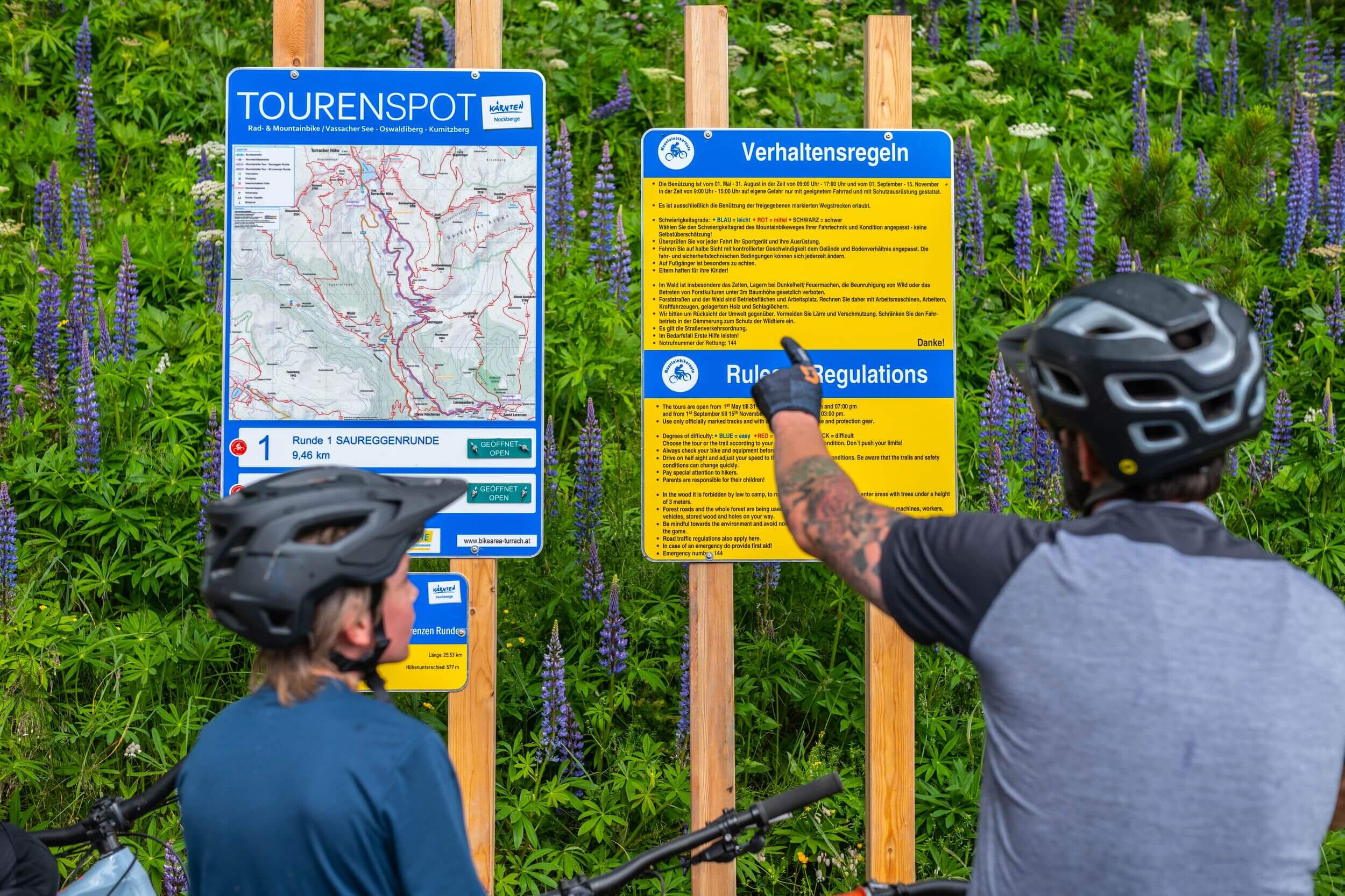 - Die Trails dürfen ausschließlich während der Betriebszeiten der Seilbahnen von 9:00 bis 16:00 Uhr befahren werden.