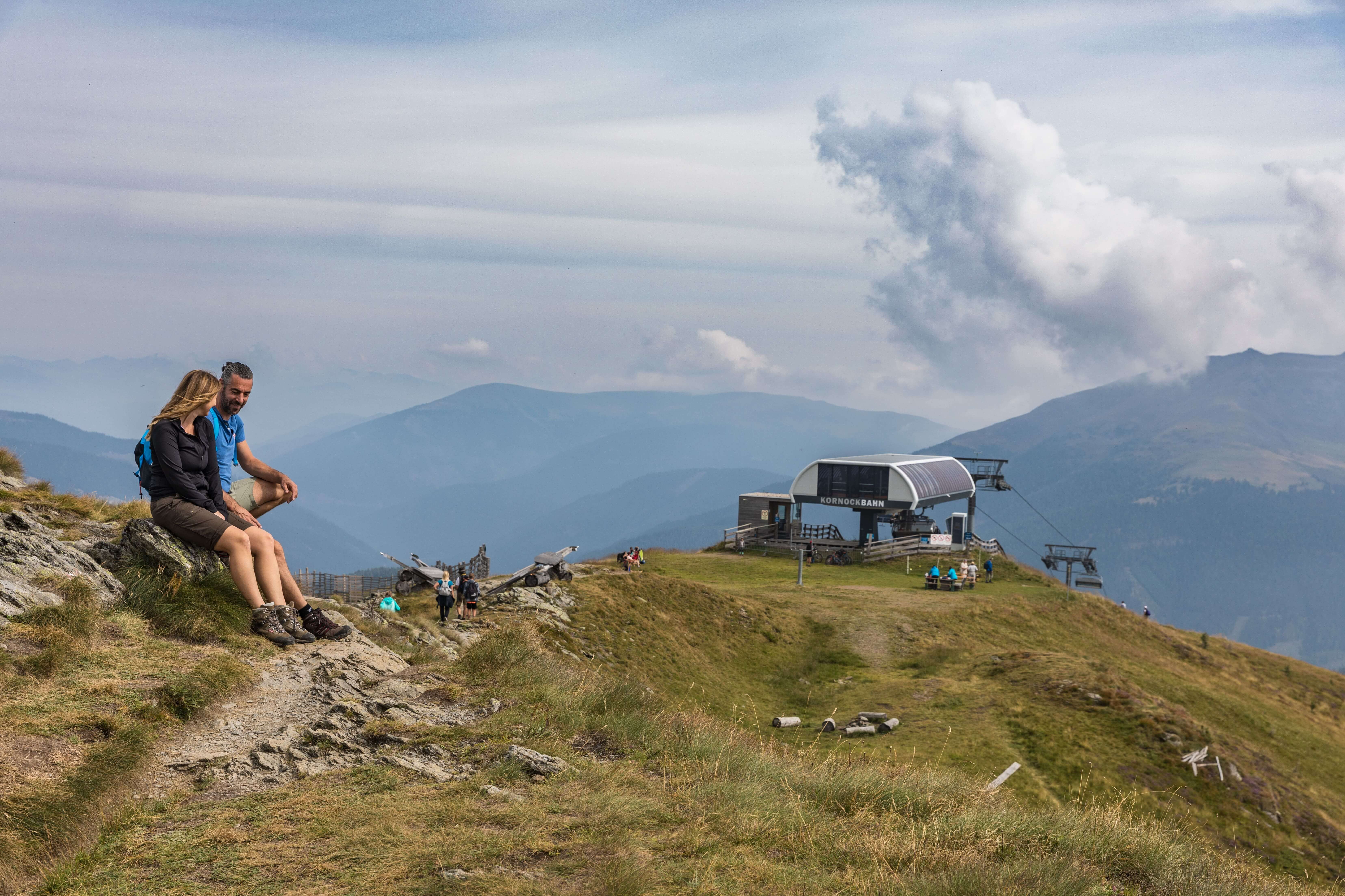 Der Gipfel liegt auf 2334 Meter Seehöhe. Vom Ausstieg der Bahn sind es rund 130 Höhenmeter bis nach oben. Der Weg ist gut markiert und in etwa 45 Minuten gut zu schaffen. Oben angekommen, öffnet sich der Blick auf die sanften Nockberge und die drei Seen der Region. Ein kurzer Stopp mit Jause, dann geht es denselben Weg zurück.