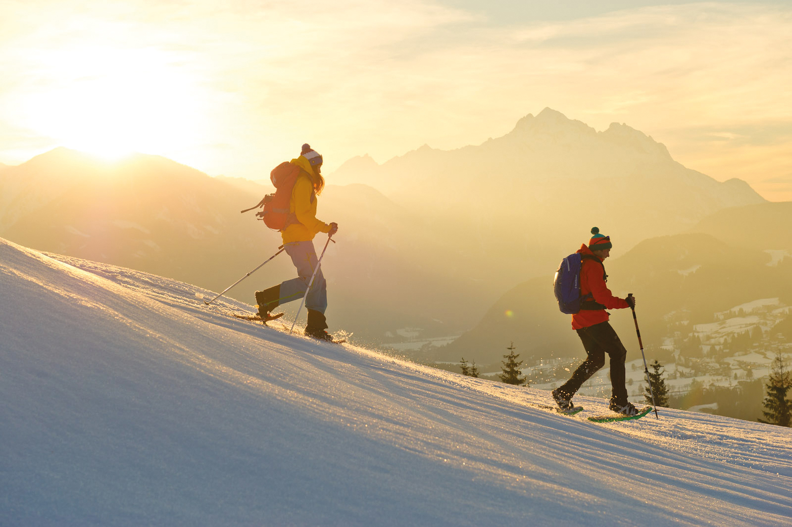 Beim Schneeschuhwandern trainiert man hauptsächlich Beine und Po, aber auch den Rücken und die Oberarmmuskulatur freut's!