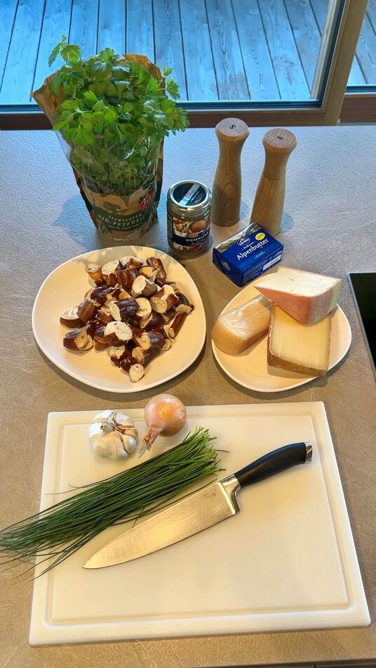 Die Tiroler Brezensuppe war früher auf vielen Almen ein typisches Alltagsgericht. Aus altbackenen Brezen, etwas Suppe und ein bisschen Käse wurde schnell ein wärmendes, sättigendes Essen. Heute kennt sie kaum noch jemand und genau deshalb finden wir: höchste Zeit, sie wieder einmal auf den Tisch zu bringen. Perfekt für alle, die nach einem aktiven Tag etwas Deftiges suchen, das schnell geht und allen schmeckt. Ein schnelles Ferienhaus Gericht, das einfach immer passt.