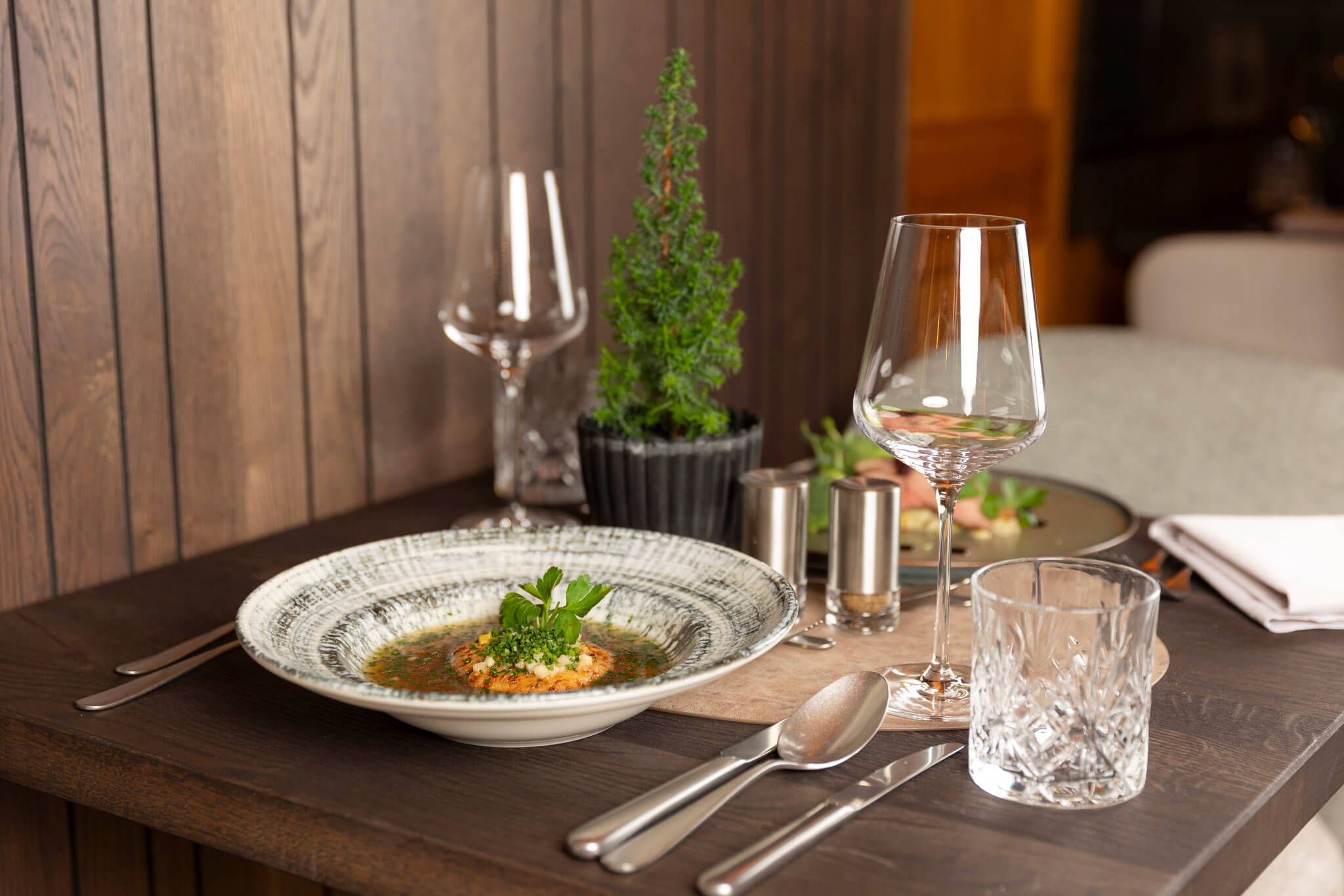 The ALPS KITCHEN Kaprun restaurant impresses with its stylish ambience, spacious dining room, cosy bar and sunny terrace. Have you booked a hotel room or suite? Daily half board is included in the room price. Guests spending their holiday in our apartments can book the extensive breakfast buffet as an option.