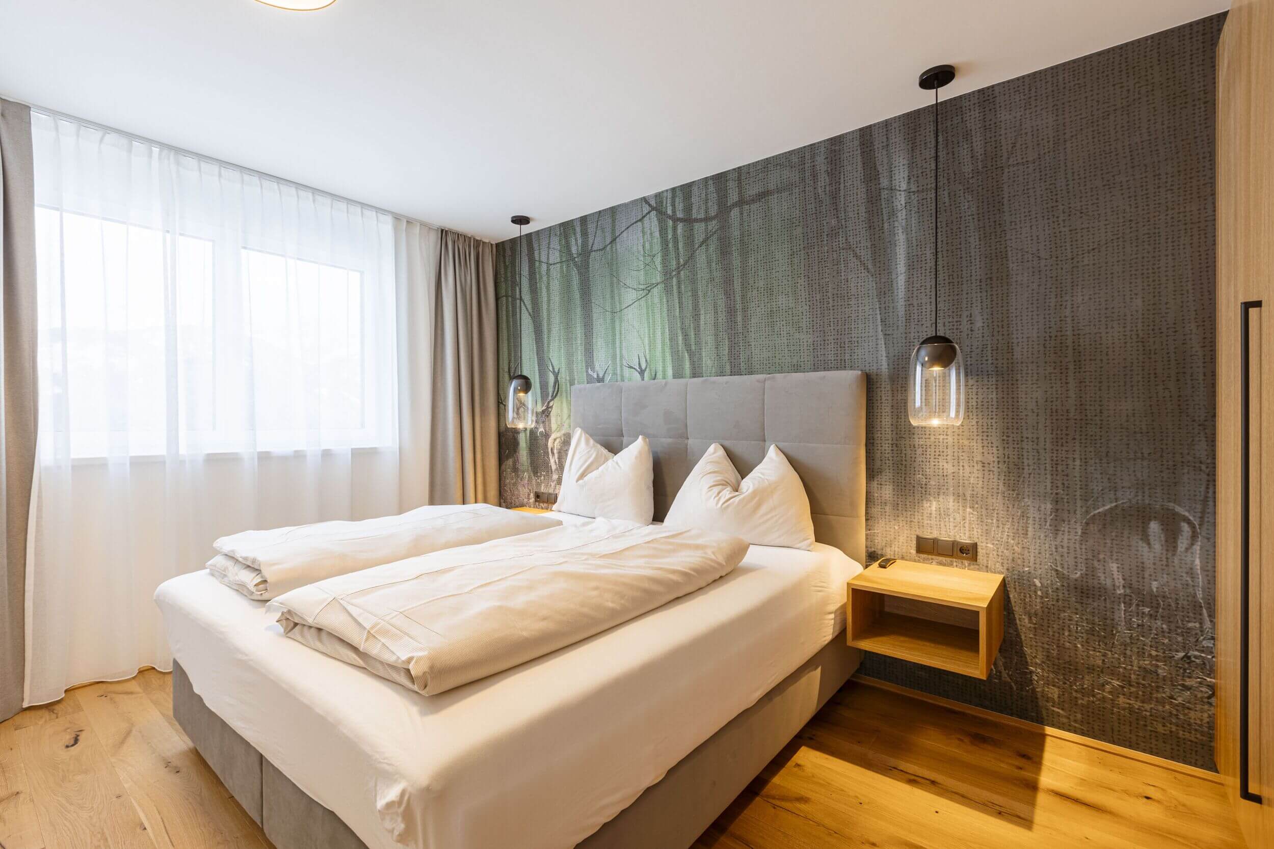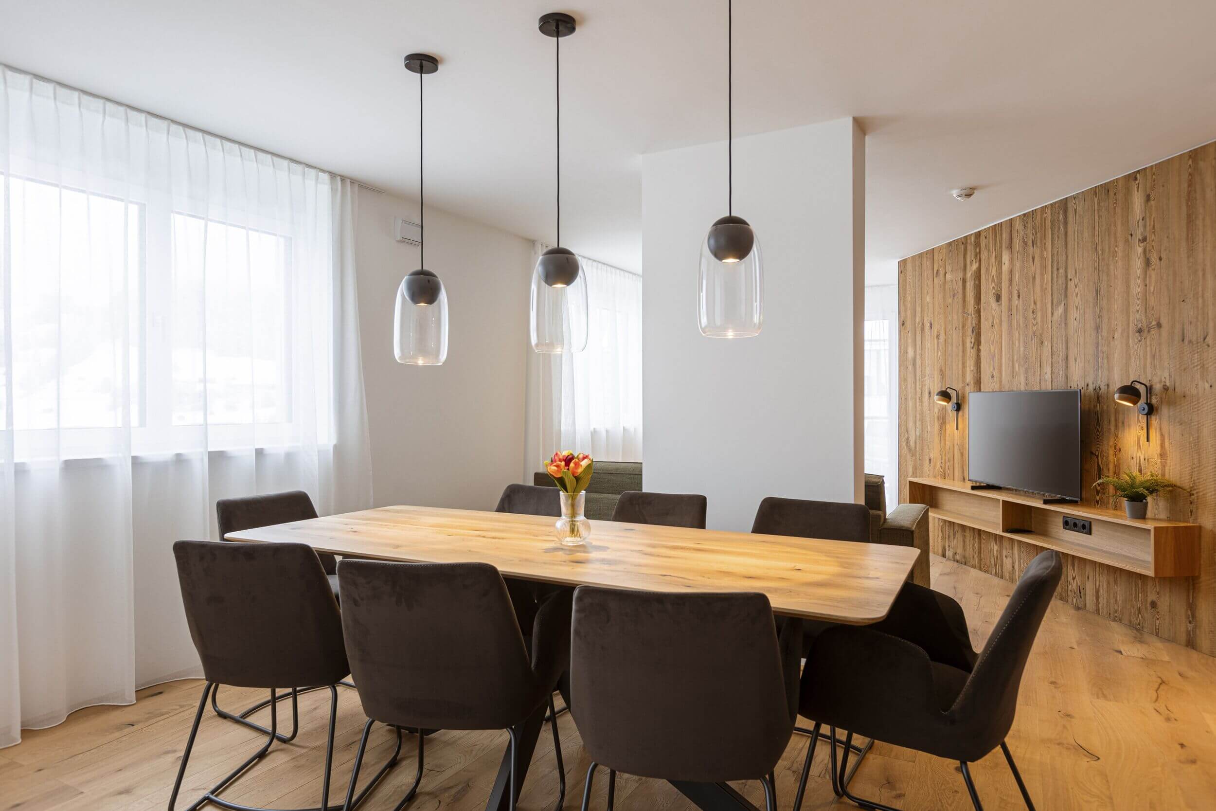 Great importance was attached to high-quality materials when furnishing the holiday apartments: comfortable box-spring beds, fully equipped fitted kitchens, cosy sofas and modern wallpaper create a sophisticated living experience. A particularly harmonious ambience, which is also reflected in the wellness area and the ALPS KITCHEN restaurant.