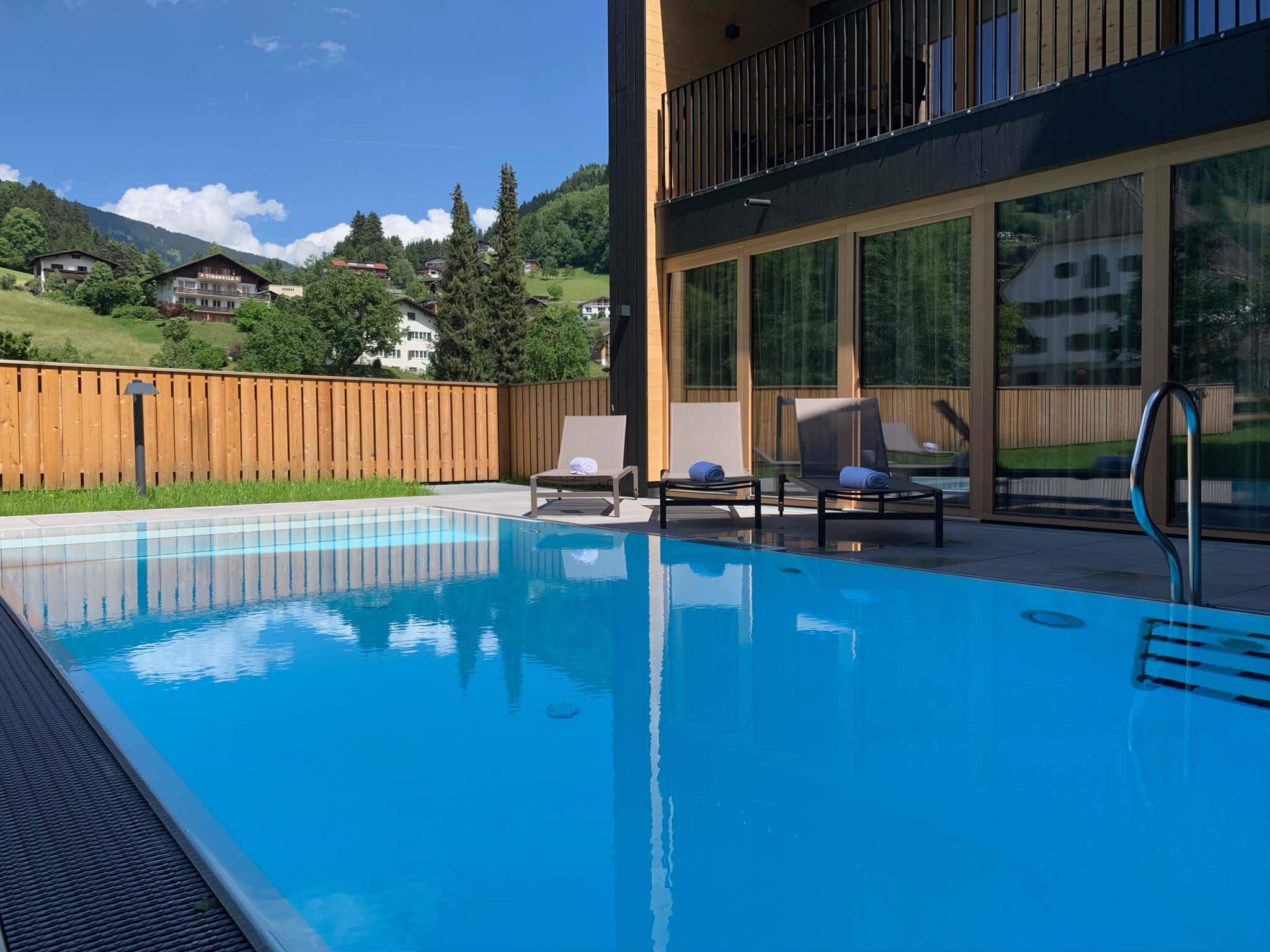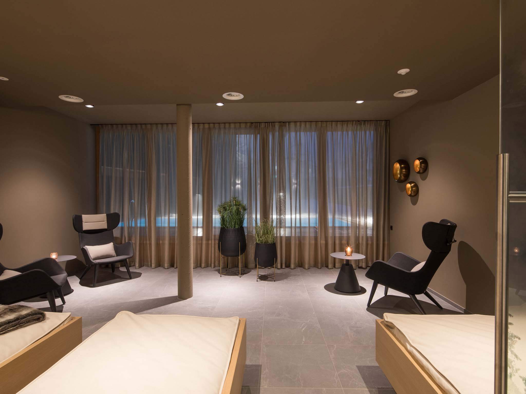 Modern comfort meets relaxation and regeneration in the wellness area of the Montafon Suites Schruns. Find peace and relaxation in the sauna or steam bath and enjoy the view of the surrounding Montafon mountains from the heated outdoor pool. The relaxation area is equipped with comfortable loungers and offers the ideal place to slow down.