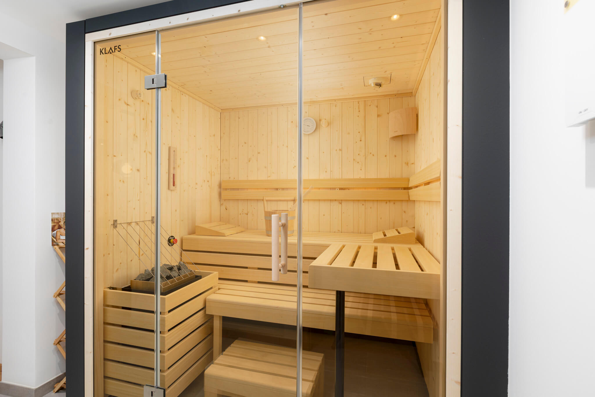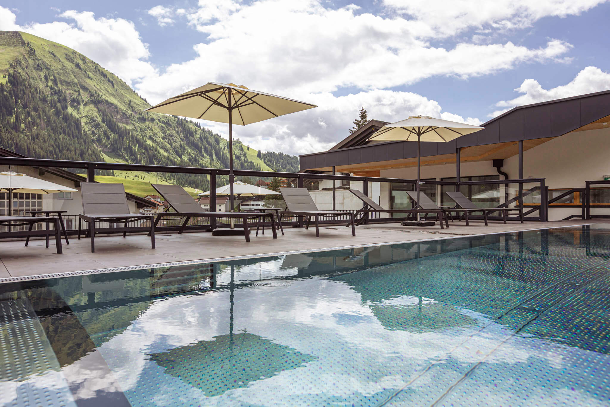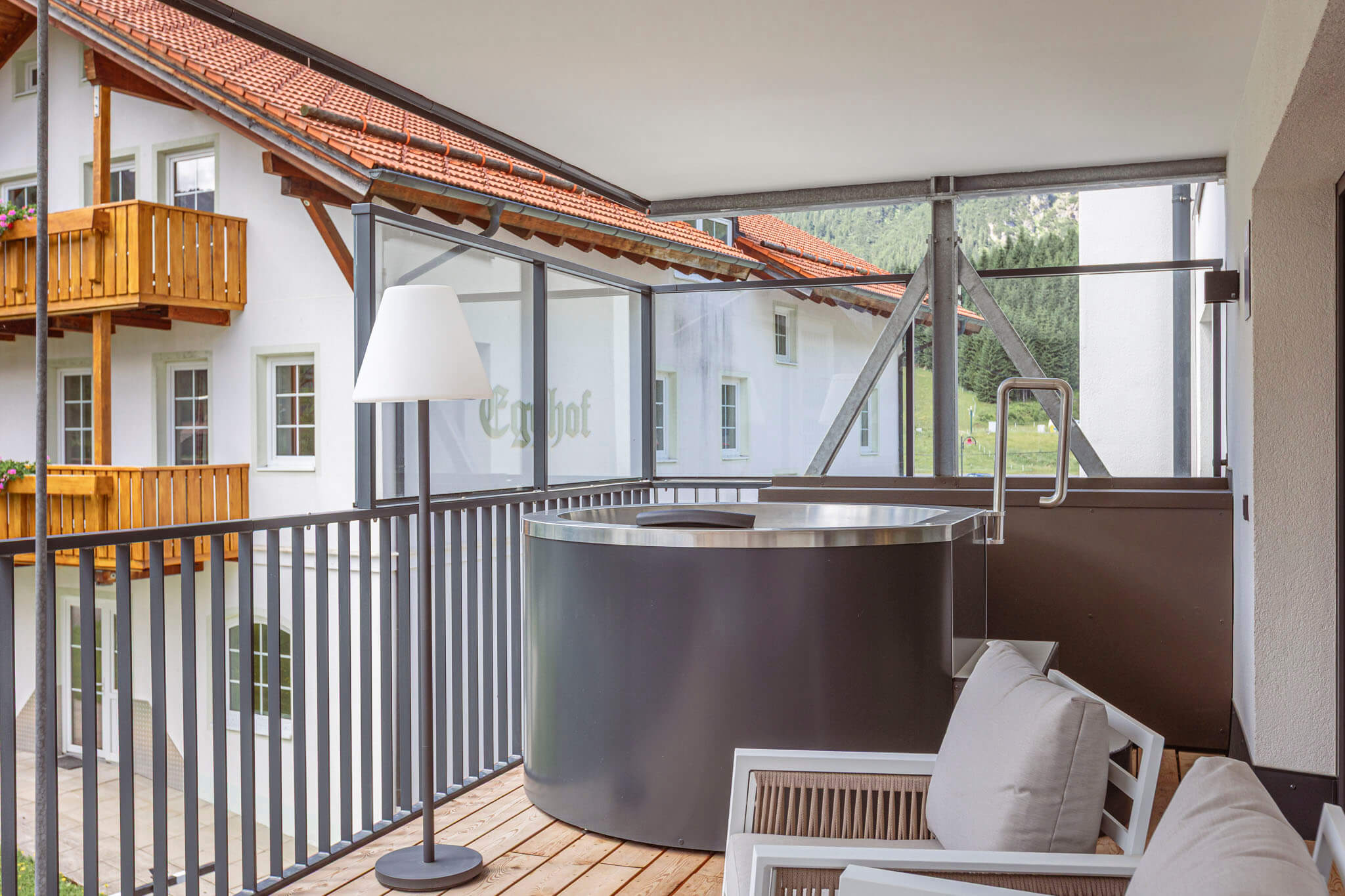 Unser gemeinschaftlicher Wellnessbereich bietet dir einen beheizten Infinity-Pool mit Terrasse und Sonnenliegen sowie eine Panoramasauna mit herrlichem Blick auf die umliegende Bergwelt. So genießt du das ganze Jahr über erholsame Stunden nach aktiven Tagen in der Tiroler Zugspitz Arena. Ein besonderes Highlight ist das Private Spa in jeder Ferienwohnung: In deiner eigenen Sauna und im privaten Hot Tub entspannst du ganz ungestört – flexibel und in privater Atmosphäre.