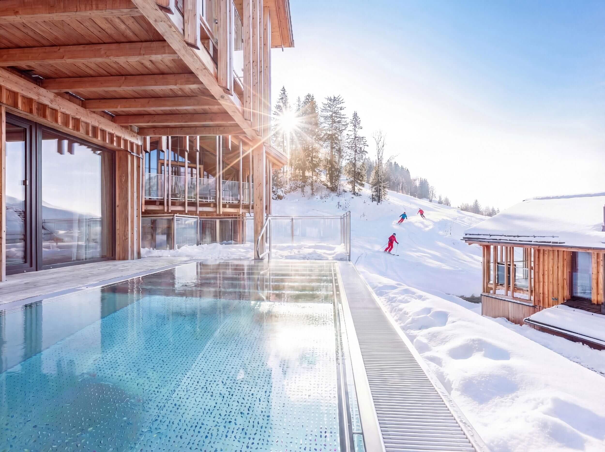 Ein besonderes Highlight ist der private Wellnessbereich in vielen Ferienhäusern. Hier sorgen Finnische Sauna, Whirlpool oder ein beheizter Outdoor-Pool (bis 28 °C) für Entspannung nach aktiven Tagen in den Bergen. Ob nach einer Wanderung im Sommer oder einem Skitag im Winter – hier lässt du den Tag ruhig ausklingen und genießt den Blick ins Ennstal und auf das Dachsteinmassiv.