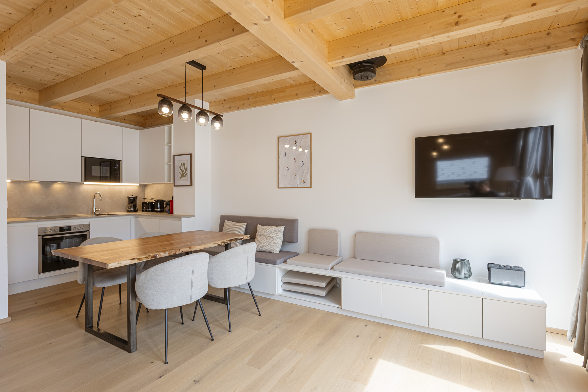 Ich war Ende Juli mit meinem Mann im Urlaub. Da wir nach weiteren Informationen zu diesem Alps Resorts im Lachtal suchten und überall dieselben Fotos waren, beschloss ich, sie zu teilen. Der Ort und die Anlage sind wunderschön, alles ist neu, ABER!!! Über diese Leiter gab es nirgendwo Informationen! Als wir um 22 Uhr ankamen und den Berg bestiegen, wurde ich hysterisch, ich verstand nicht, wie ich da runterkommen sollte?? Und nachts?? Und auf die Toilette??? Leider gab es nirgendwo Informationen über diese Leiter! Ich finde, die Leute haben das Recht zu wissen, wofür sie bezahlen und sie sollten selbst entscheiden, ob es ihnen passt!!! Das war ein Schock für uns. Wie uns der Verwaltungsmitarbeiter am Telefon sagte, ist das ein architektonischer Entwurf. Was??? Dann informiert man die Leute, damit sie bei der Buchung Bescheid wissen! Und das, obwohl wir ein Paar über 40 sind, und wenn die Leute älter sind??? Das ist Lebensgefahr! Das ist lebensgefährlich! Es fehlte auch eine Kommode für persönliche Gegenstände, da die Eckbereiche mit unserem Koffer und unserer Tasche belegt waren, was Chaos ins Zimmer brachte. Es gab auch zwei hohe Kissen, na ja, viel zu hoch, sodass sie weder für unsere Körpergröße von 185 cm noch für unsere Körpergröße von 160 cm geeignet waren. Am nächsten Tag brachten sie uns Ersatzkissen. Alles andere war super. Sie haben eine gut ausgestattete Küche, alles, was Sie brauchen, ist da. Sie müssen 10 km die Serpentinenstraße hinauf zum Chalet fahren. Um zum Supermarkt zu gelangen, müssen Sie auch 10 km hinunter zur Autobahn fahren. Was die Ruhe betrifft, fließt vor dem Hotel ein Bach über die Straße, den Sie höchstwahrscheinlich hören werden, und morgens auch ein paar Autos, sofern Sie einen sehr empfindlichen Schlaf haben und Ihnen das wichtig ist. Ich würde gerne wiederkommen, aber nur in ein anderes Chalet, wo es normale Stufen gibt.