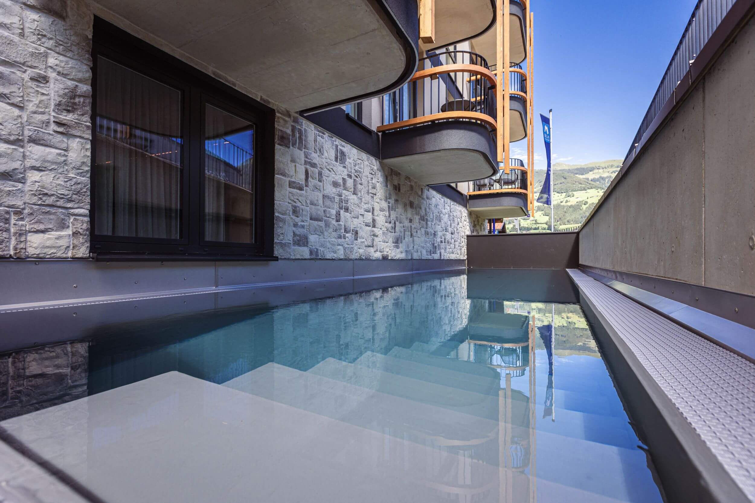 De stijlvolle sfeer van je appartement wordt voortgezet in onze wellnessruimte. De spa van 200 m² is de ideale plek om te ontspannen en beschikt over een Finse sauna, een biosauna en een infraroodcabine. Je kunt kiezen tussen intense warmte en zachte warmte naar jouw smaak. Je kunt achteroverleunen en ontspannen in de ligstoelen, terwijl het verwarmde buitenzwembad je uitnodigt om het hele jaar door te zwemmen en op te frissen. Op het terras kun je genieten van een prachtig uitzicht op de omliggende bergen; er is ook een aparte kleedkamer met douches.