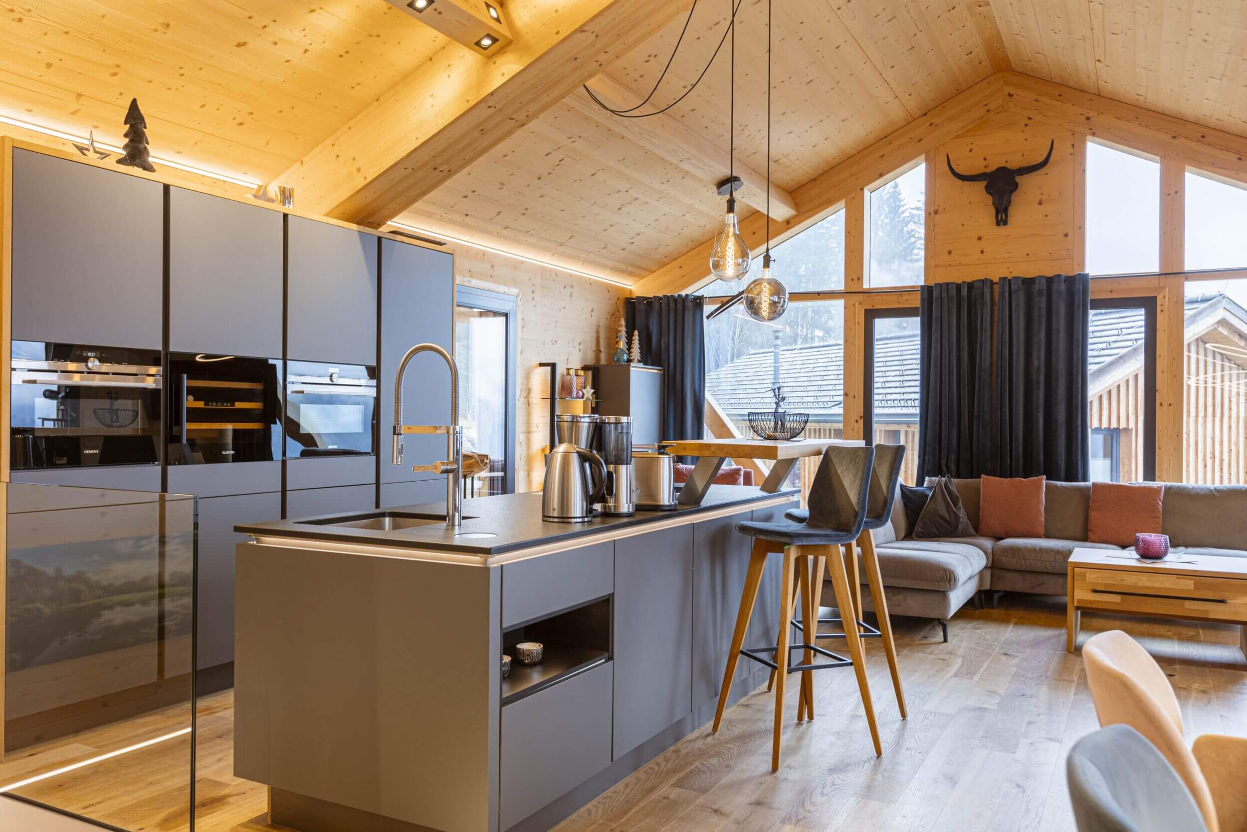Unsere Ferienhäuser und Ferienwohnungen in Haus im Ennstal bieten helle Wohnräume mit viel Holz, gemütliche Schlafzimmer und eine voll ausgestattete Küche. Viele Unterkünfte verfügen über eine private Sauna, einen Whirlpool oder einen beheizten Pool auf der Terrasse. Die Chalets liegen direkt an der Piste – ideal für alle, die im Winter mit den Skiern vor der Haustür starten möchten.